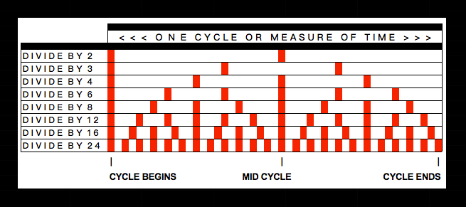 | If the circular visuals are difficult to follow, we can alternatively view the subdivisions in a grid-like format, keeping in mind that the cycle repeats once it reaches the end. This visual format is helpful for viewing how the divisions relate to each other within one full cycle. |